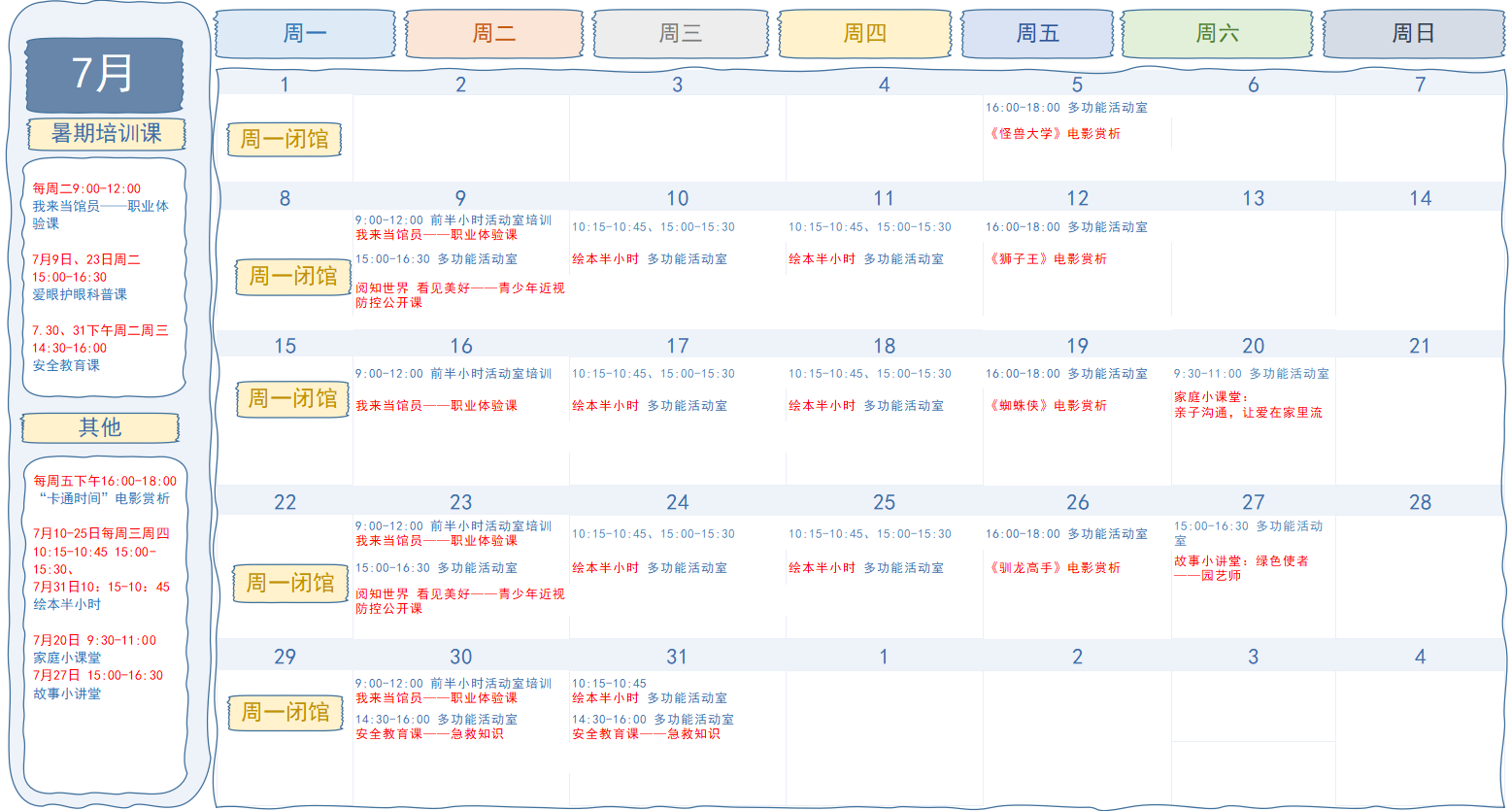 2024年7月中心館少兒服務(wù)區(qū)活動(dòng)安排如下: