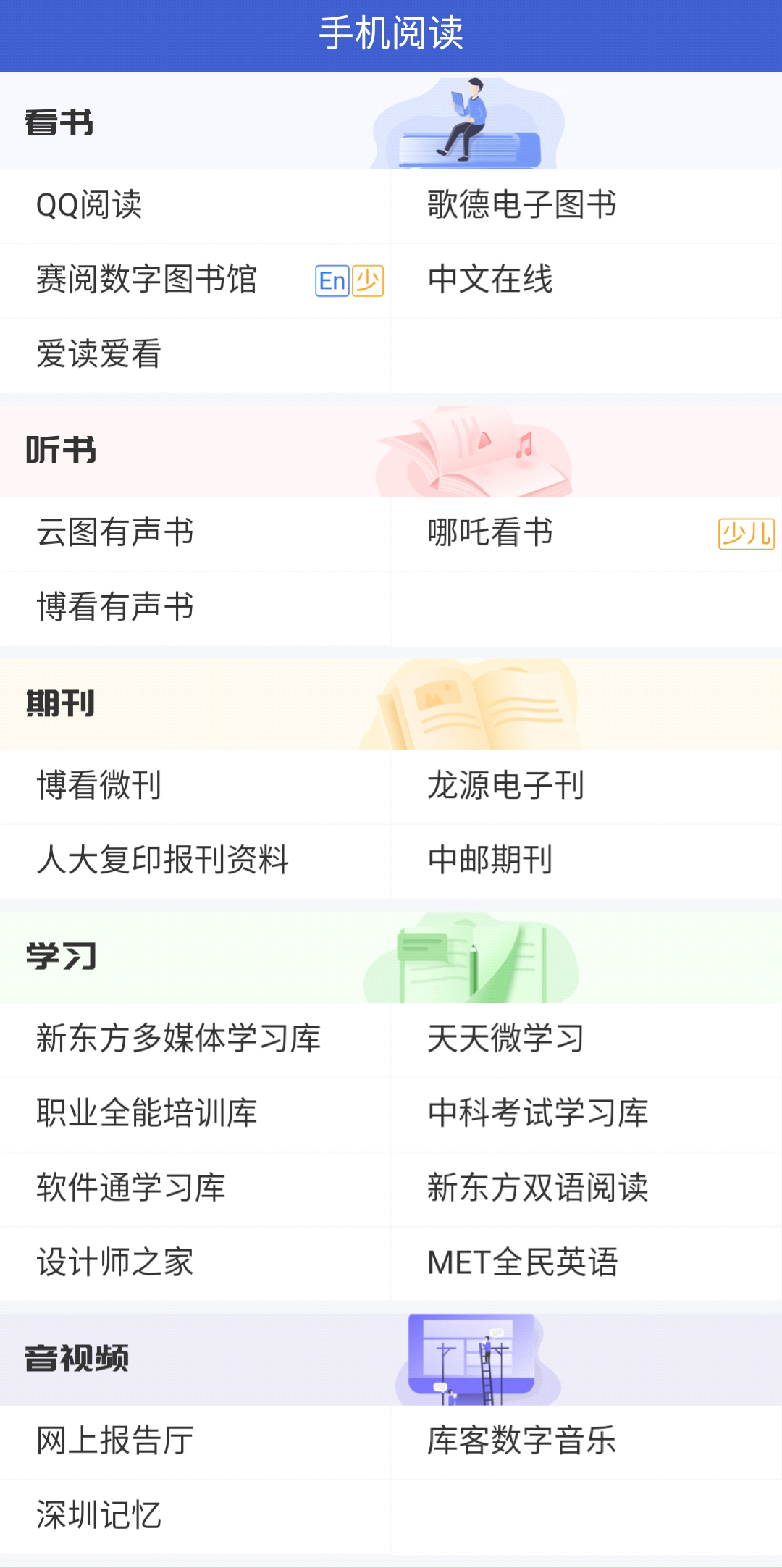 為讀者提供豐富的適合手機(jī)閱讀的數(shù)字資源,包括電子圖書(shū)、有聲圖書(shū)和視頻資源。讀者可以通過(guò)下列路徑訪(fǎng)問(wèn)和使用這些資源: