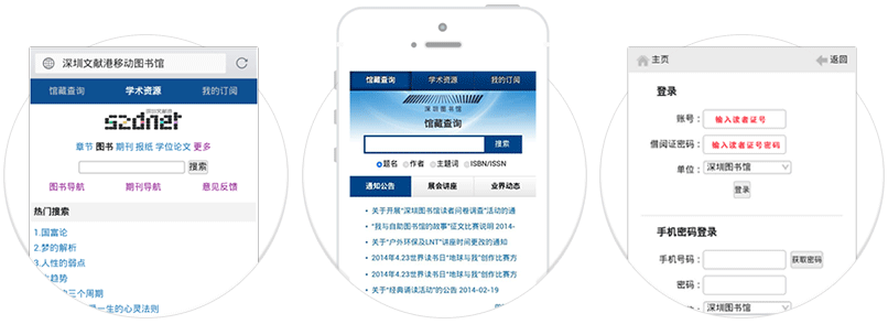 通過移動終端(如智能手機、平板電腦等)訪問網(wǎng)址:http://m.szwxg.5read.com/便可登錄。其中深圳圖書館的持證讀者可輸入讀者證號和密碼,其他用戶可通過輸入手機號獲取隨機密碼。